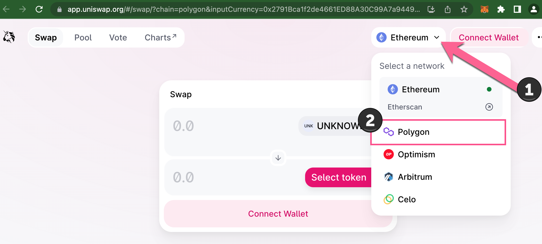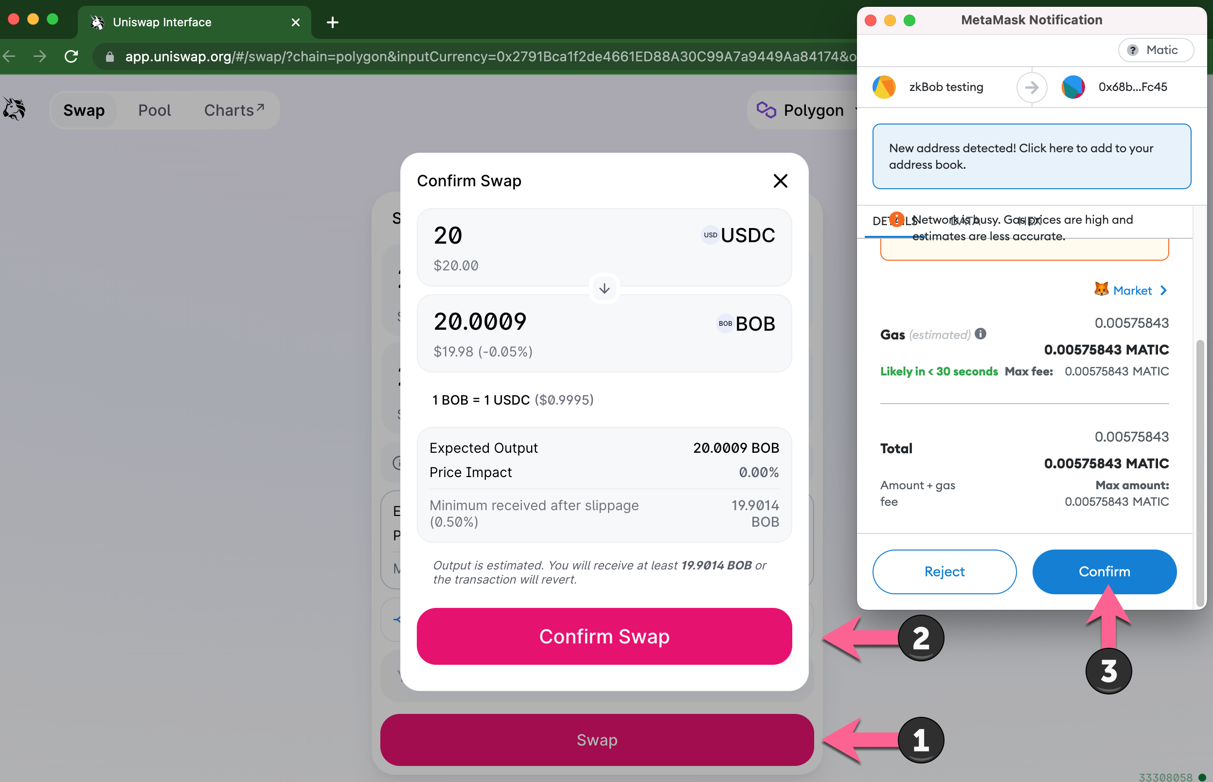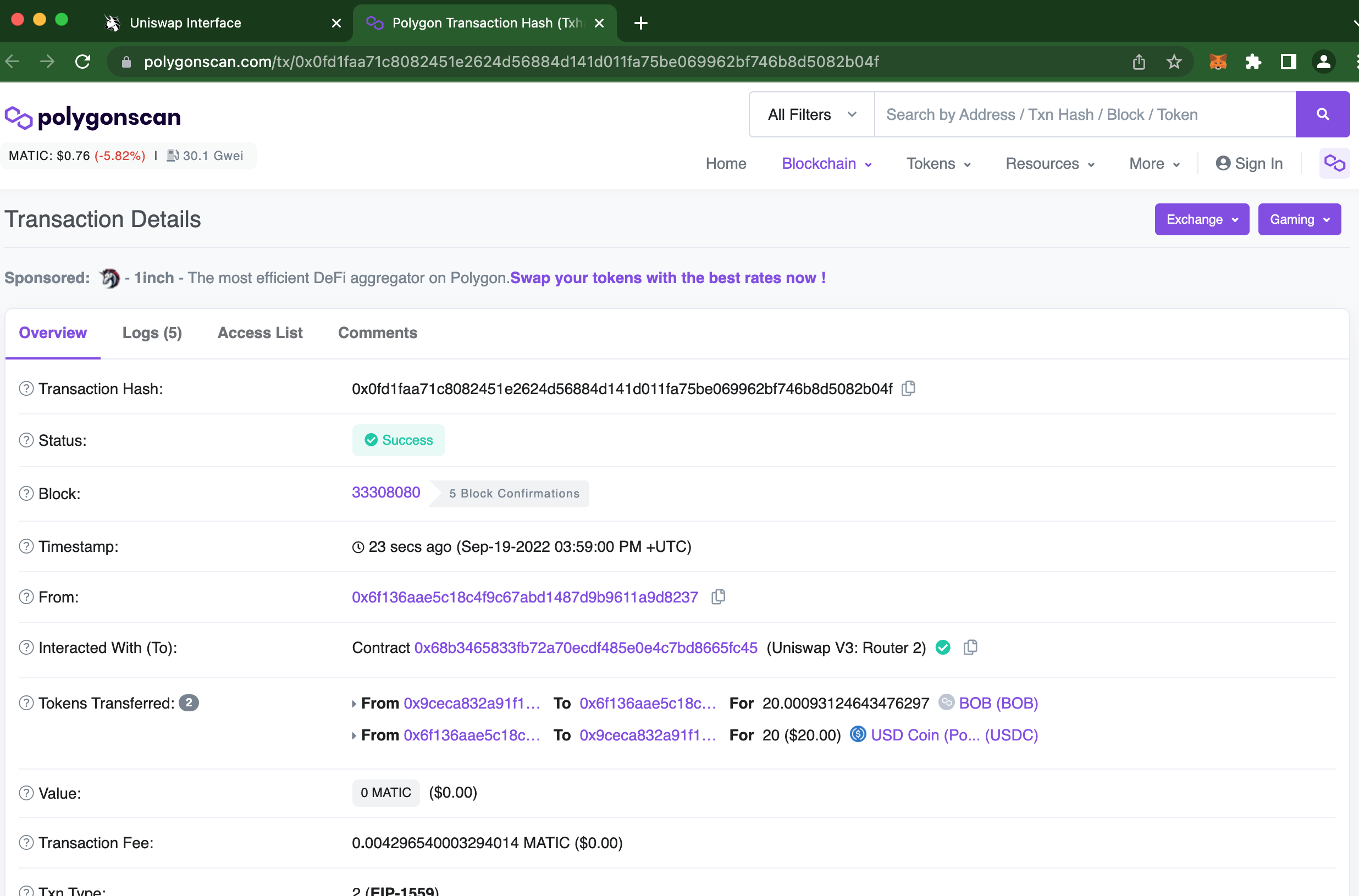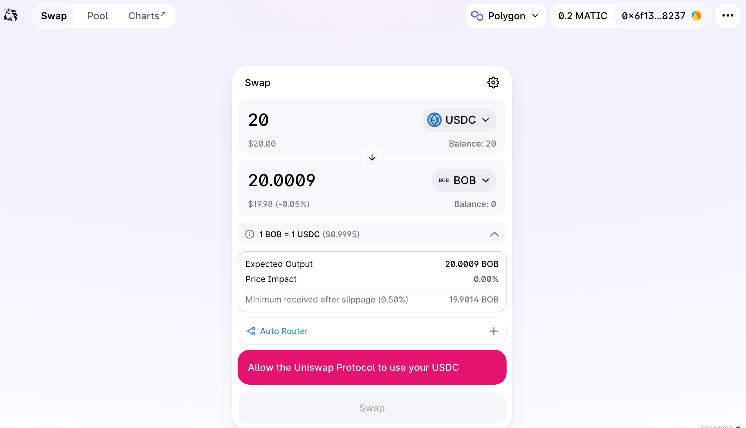 This explainer shows how to swap BOB to USDC using Uniswap v3 on Polygon.