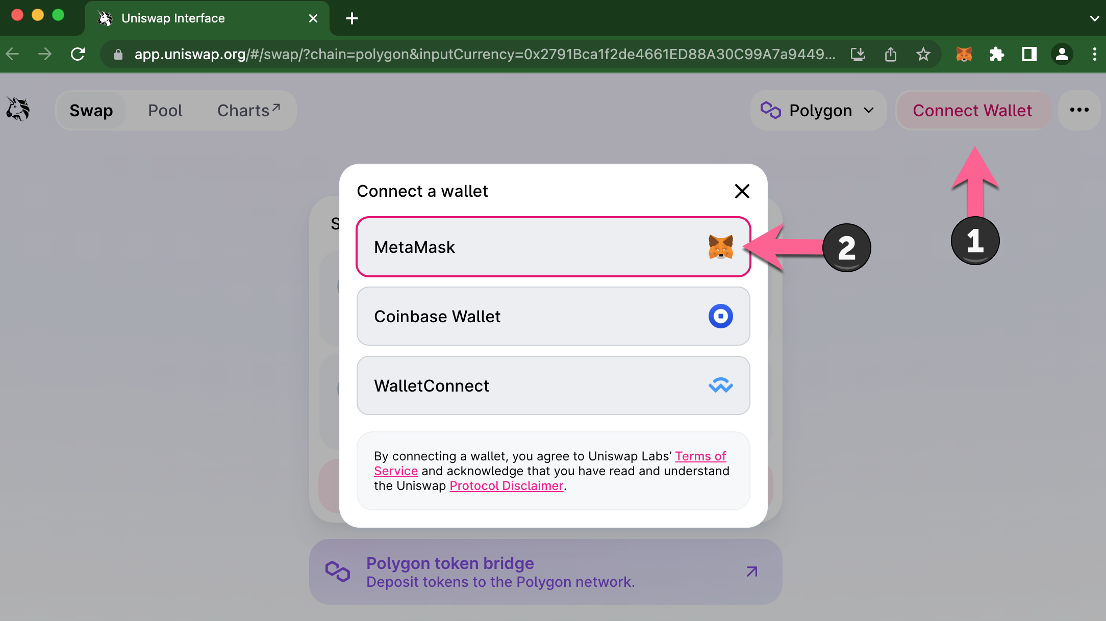 * **MATIC**: You will need a small amount of MATIC on Polygon to pay transaction fees for the trade. You can purchase, trade or bridge in numerous ways mentioned above.